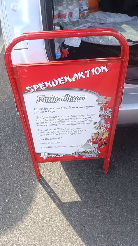An den Start gingen so um die 50 selbstgebackene Kuchen, die liebevoll von unseren Mitgliedern und Eltern gebacken wurden. Am Verkaufstag fanden sich 10 hartnäckige Verkäufer ein, die die Kuchen restlos an den Mann und Frau brachten. Gemeinsam schafften wir es eine Spendensumme von 1021,90 Euro einzunehmen. Dieses Geld kommt den Mitgliedern in Form von neuen Trainingsmittel zugute.